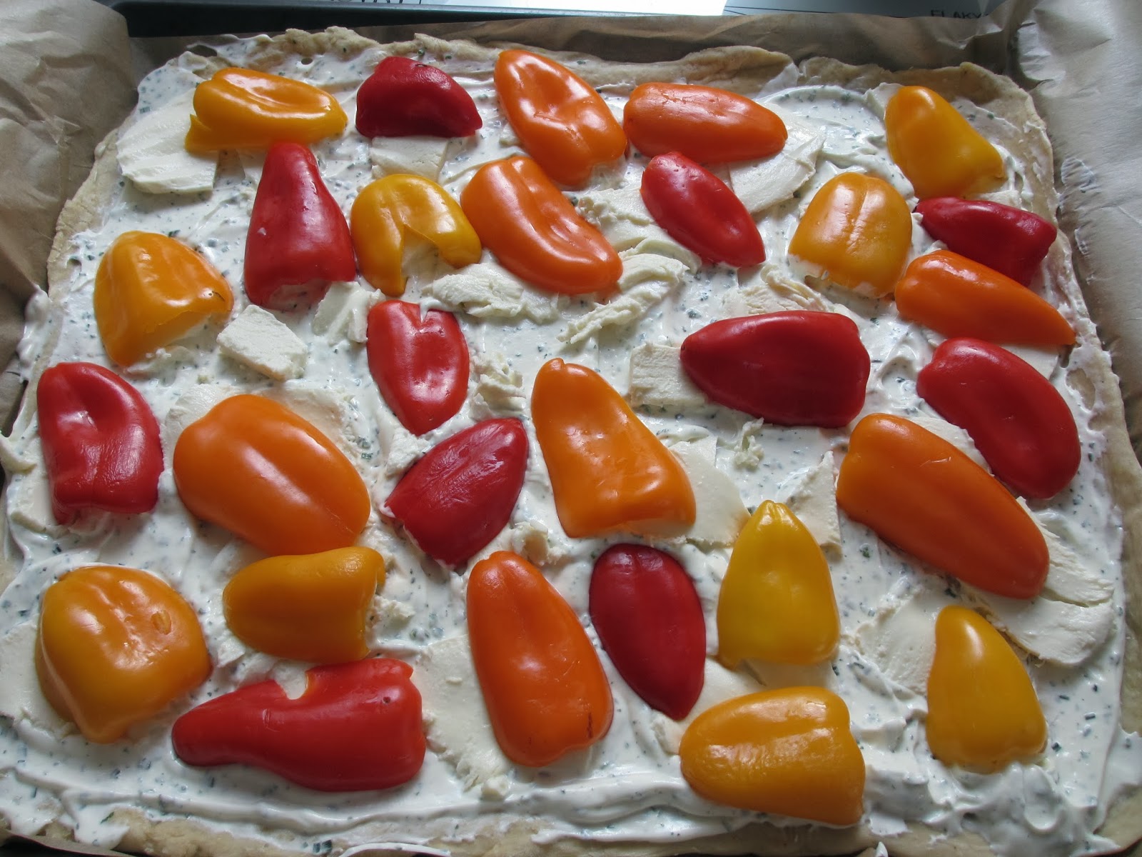 Das ganze wurde mit halbierten Minipaprika und in Scheiben geschnittenem Mozzarella belegt...